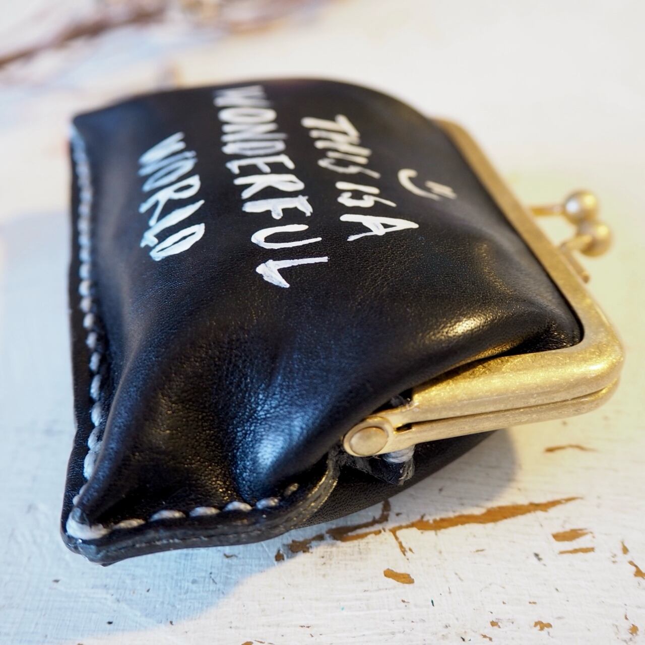 ブラックの革にホワイトで大胆に手描き文字を描き入れ、カッコよくスタイリッシュに仕上げています。