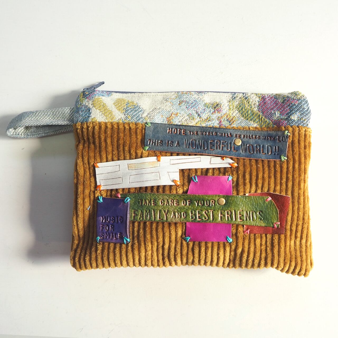 布と革でポーチを作りました。