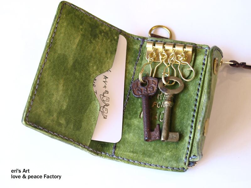 【サンプル品SALE】小銭入れ付きキーケース[モスグリーン×ブラウン/糸 グレー] OD-KEY-01