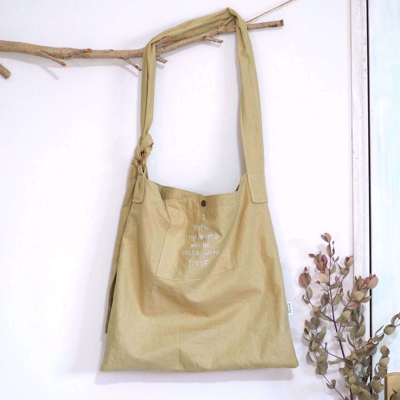 綿麻布を使い、刺繍を施した大きなショルダーバッグを作りました。