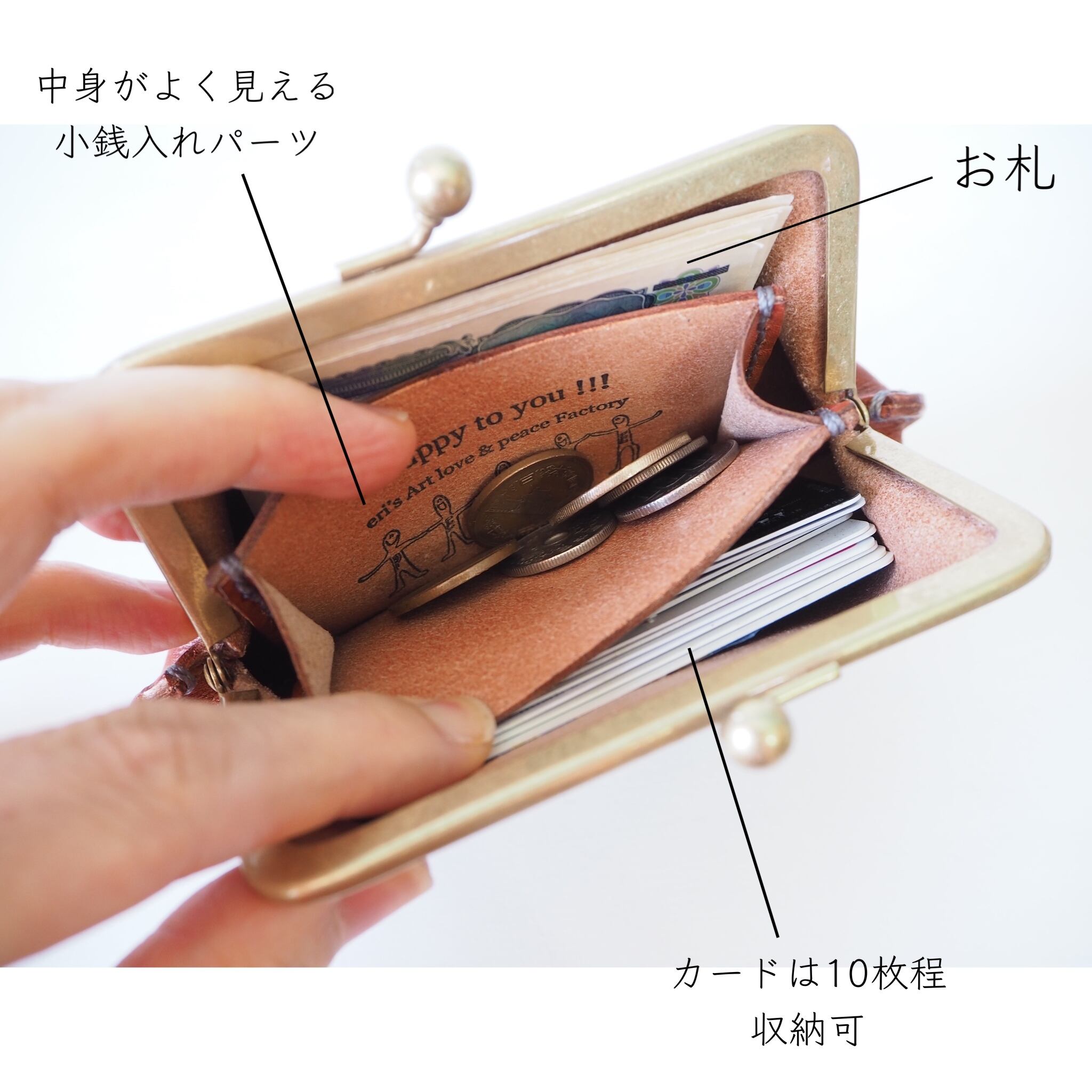 パカっと開けると、小銭入れパーツが仕切りの役目を果たし、お札、小銭、カードが分けて入れられます。