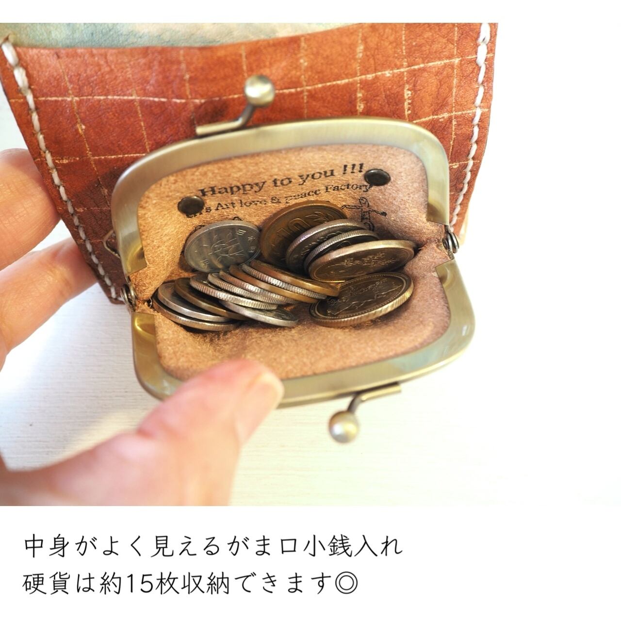 小銭入れは中身が良く見えるがま口タイプ(硬貨約15枚収納可)。