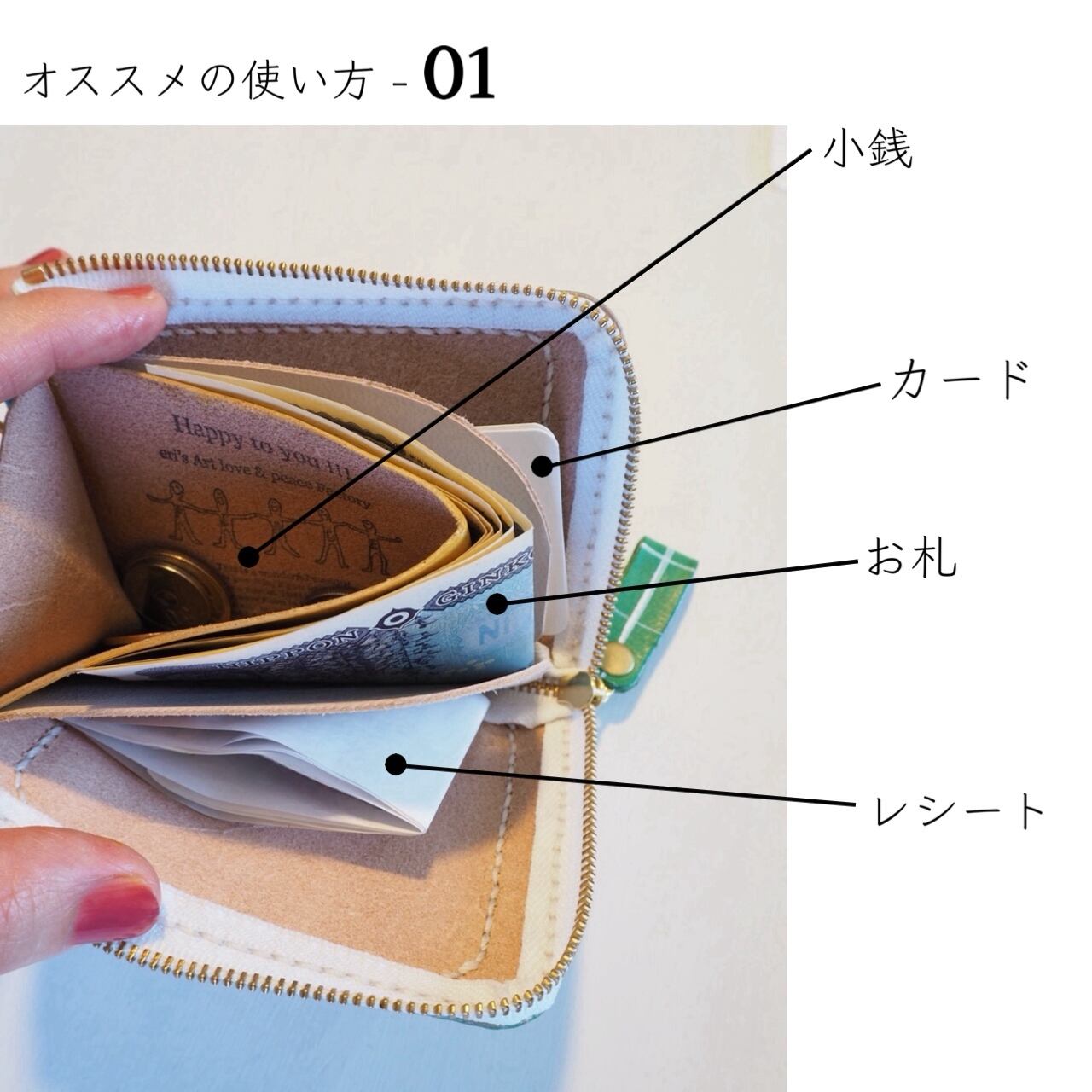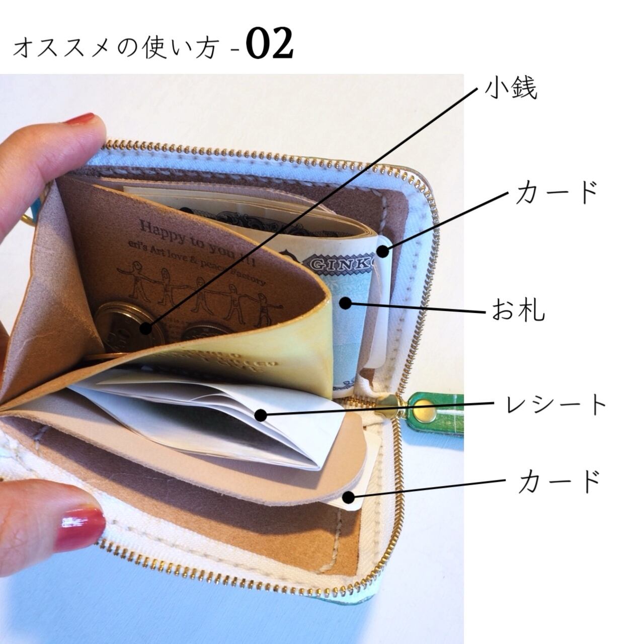 仕切りを二つ付けることで、カード、お札、レシートを分けて収納することが出来るように設計しています。